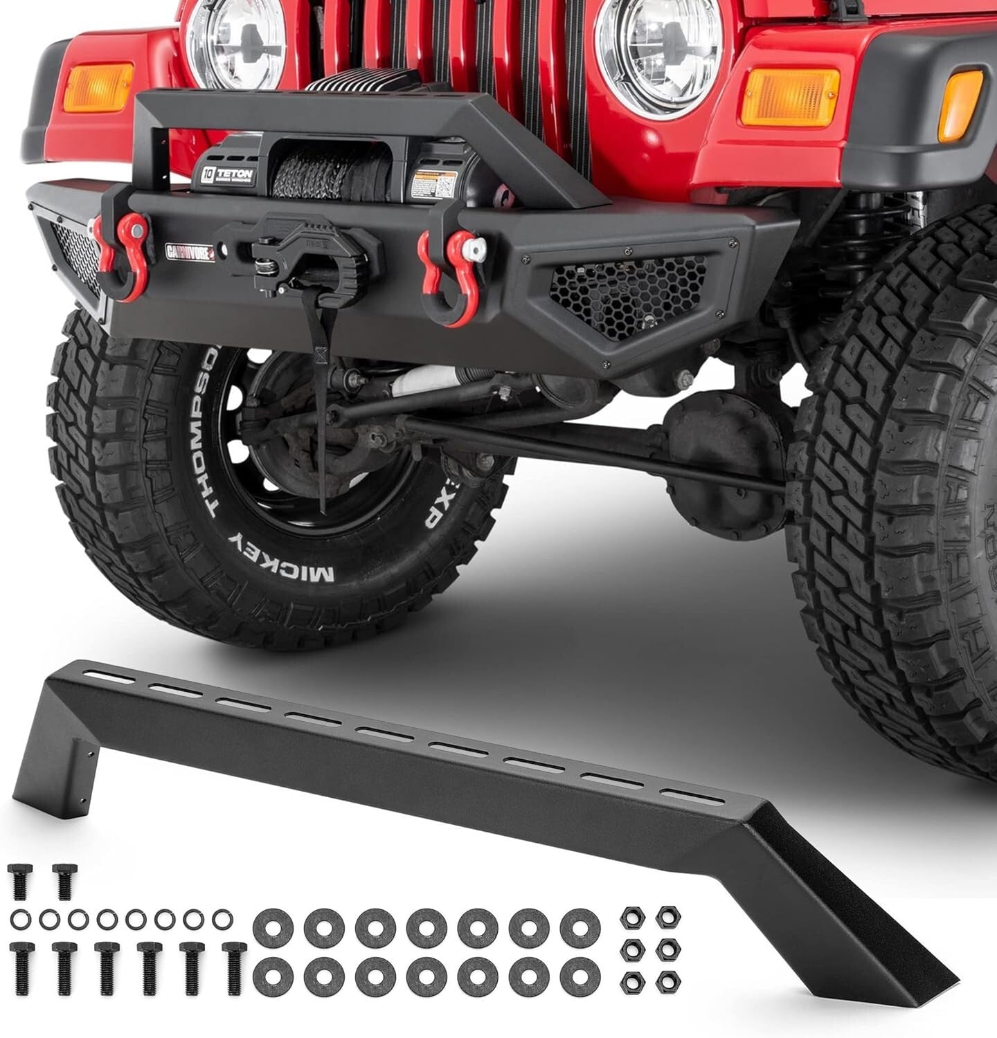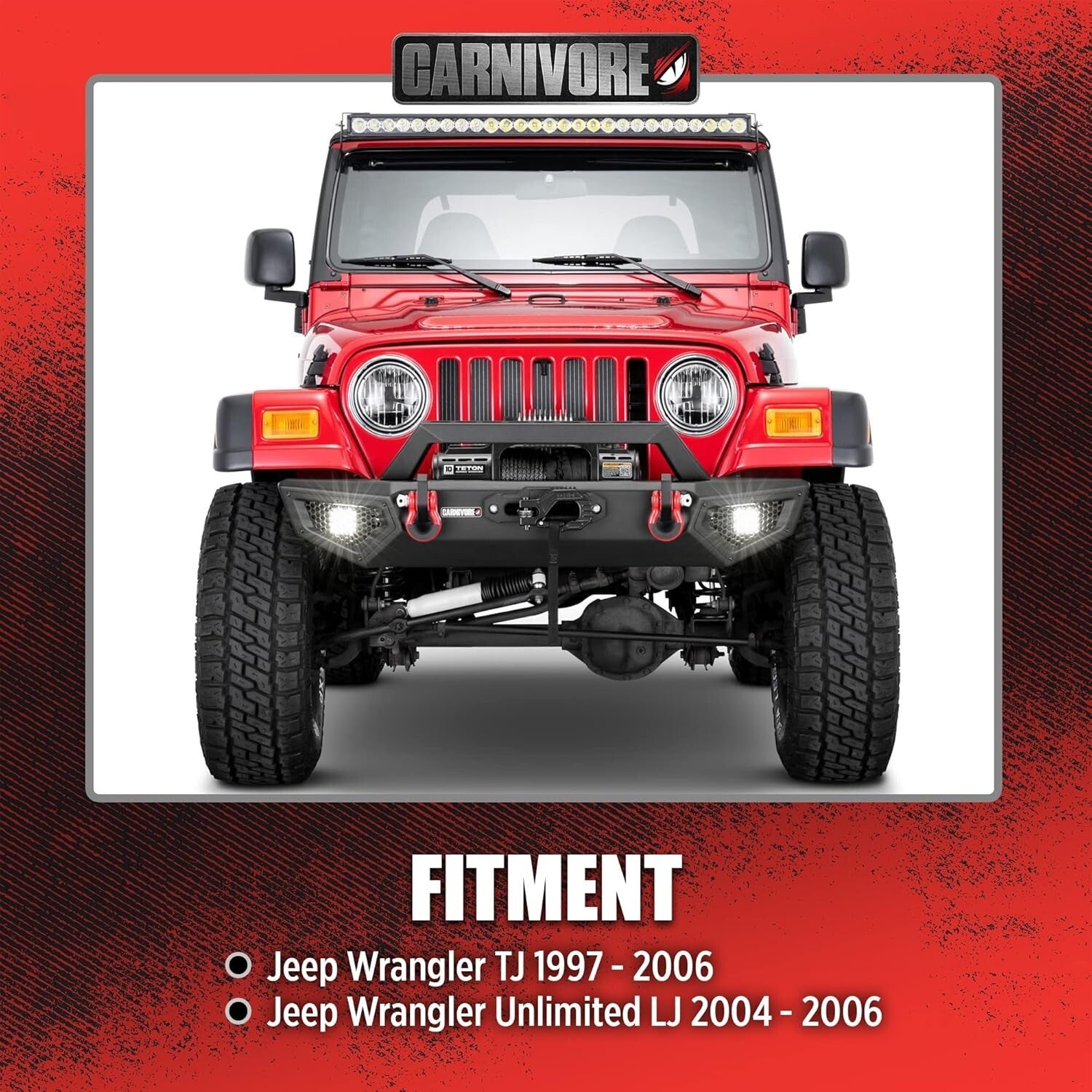Rule the street or trail with this heavy-duty, robotically-welded steel Carnivore Bumper. Exclusively designed for 1987-06 Wrangler YJ, TJ, and LJ models, this durable textured powder-coated bumper is offered in a full-width version to protect fender flares and tires, or a stubby model for those who want more aggressive trail riding adventures. Both versions include integrated fog light holes that fit factory fog lights, as well as paintable stone mesh stone guards. Full-width bumpers offer additional light mounts behind the guards to create even further personalization. Bumpers accommodate an optional over-rider bar that is slotted across the top to fit light bars or cubes for even better visibility in dark conditions. Engineered to fit most winches up to 12,000 lbs and has two reinforced two hook mounts that double as D-ring mounting locations. Includes all hardware for installation and mounts with no drilling or welding required. Features a three-year warranty.
